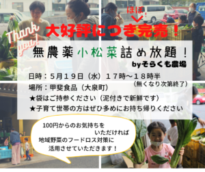 そらくも農場さんの小松菜 (1) 投稿ナビゲーション過去の投稿: 小松菜 詰め放題 好評御礼! コメントを残す コメントをキャンセルメールアドレスが公開されることはありません。 * が付いている欄は必須項目ですコメント 名前 * メールアドレス * サイト 次回のコメントで使用するためブラウザーに自分の名前、メールアドレス、サイトを保存する。